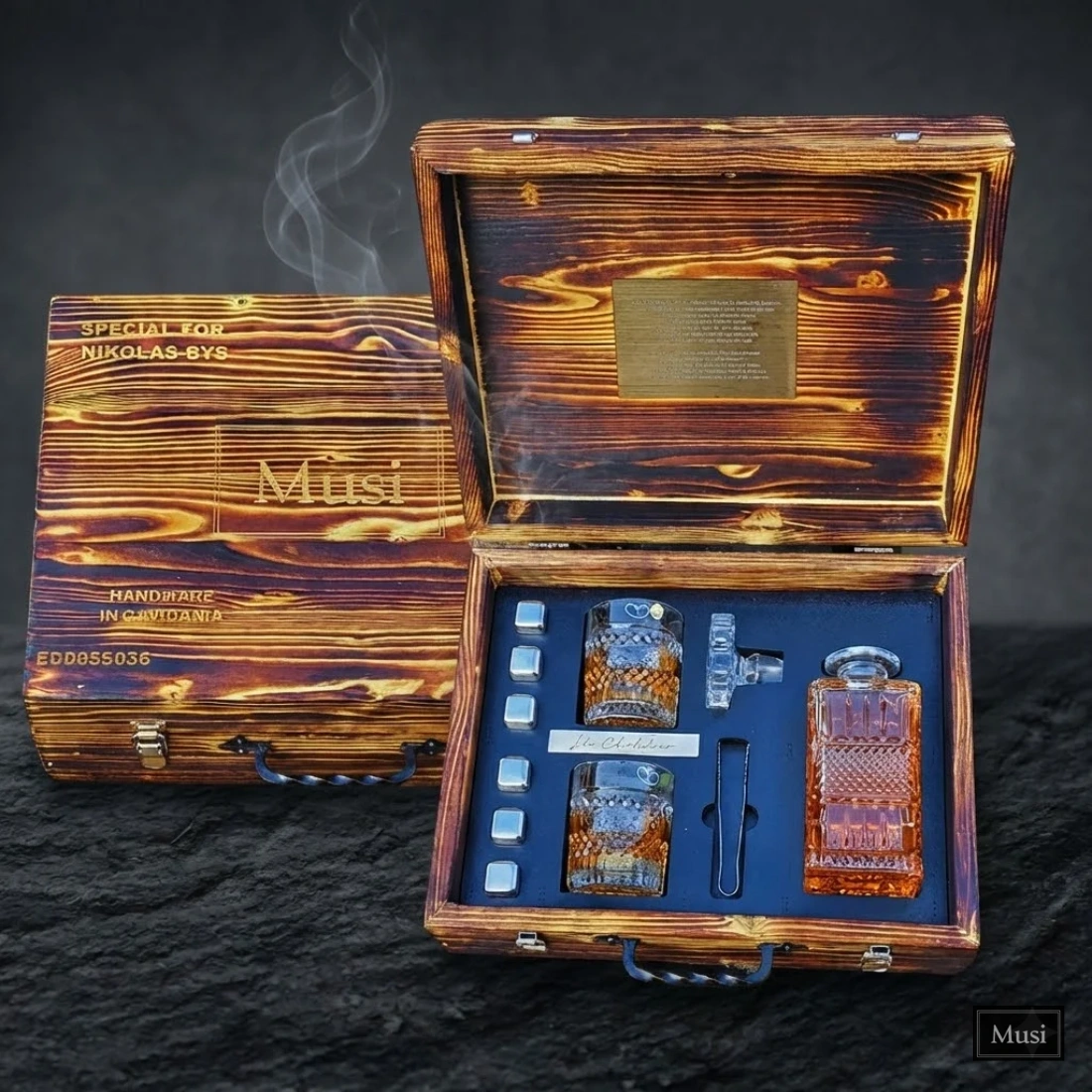 Daugkartinių šaldymo kauliukų ir taurių rinkinys rankų darbo, degintos medienos lagamine. Kaip ir visus mūsų gaminius šį rinkinį galime personalizuoti norimu tekstu, logotipu ar paveikslėliu. Norimą personalizavimą parašykite mums info@musibrand.eu