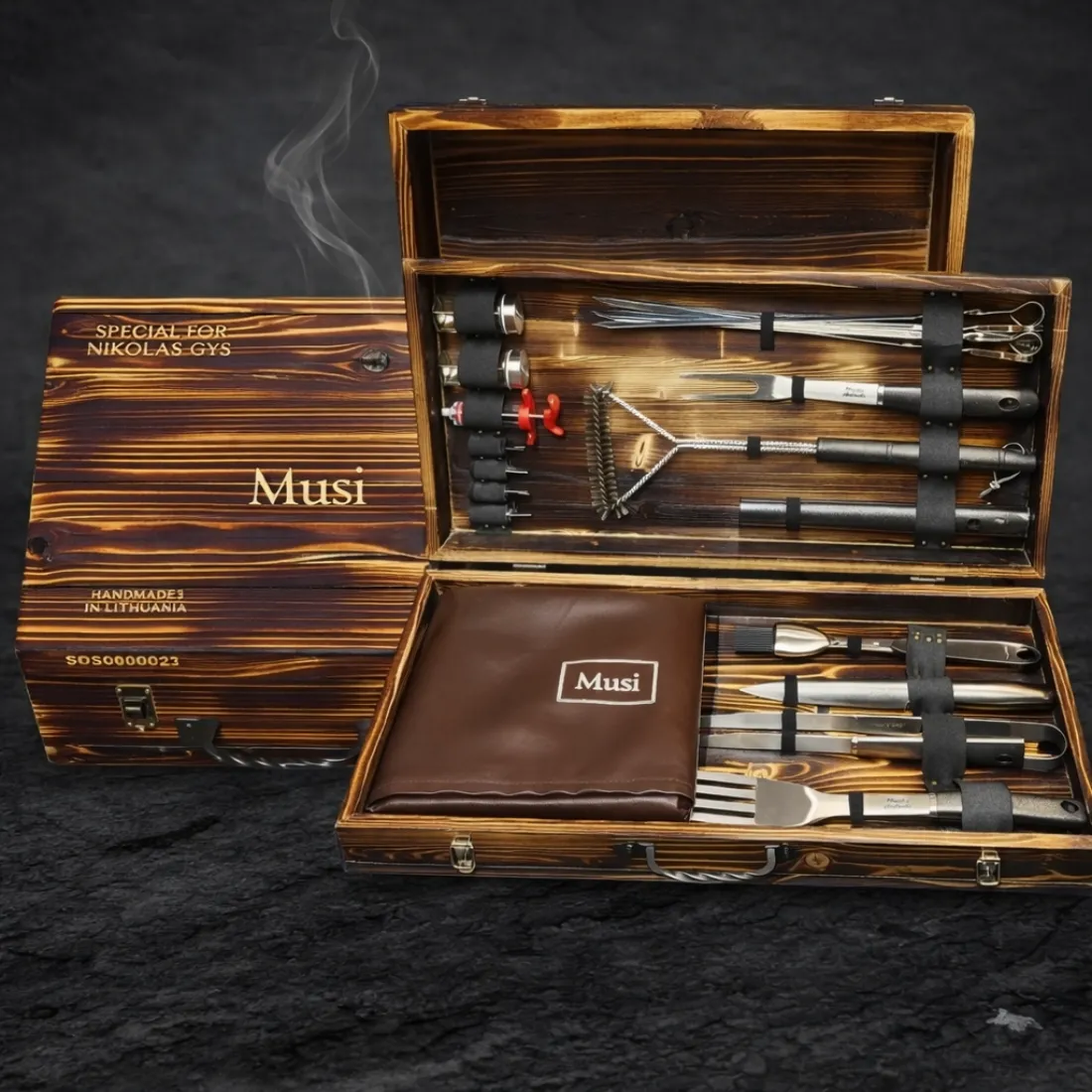 Patogus ir išskirtinio dizaino įrankių ir priemonių rinkinys, supakuotas rankų darbo, degintos medienos lagamine. Šiame rinkinyje rasite viską, ko gali prireikti kepant, vartant, papildant, tepant ar nuimant kepamus produktus, kuriuos saugiai ir lengvai galėsite gaminti pagal savo poreikius.