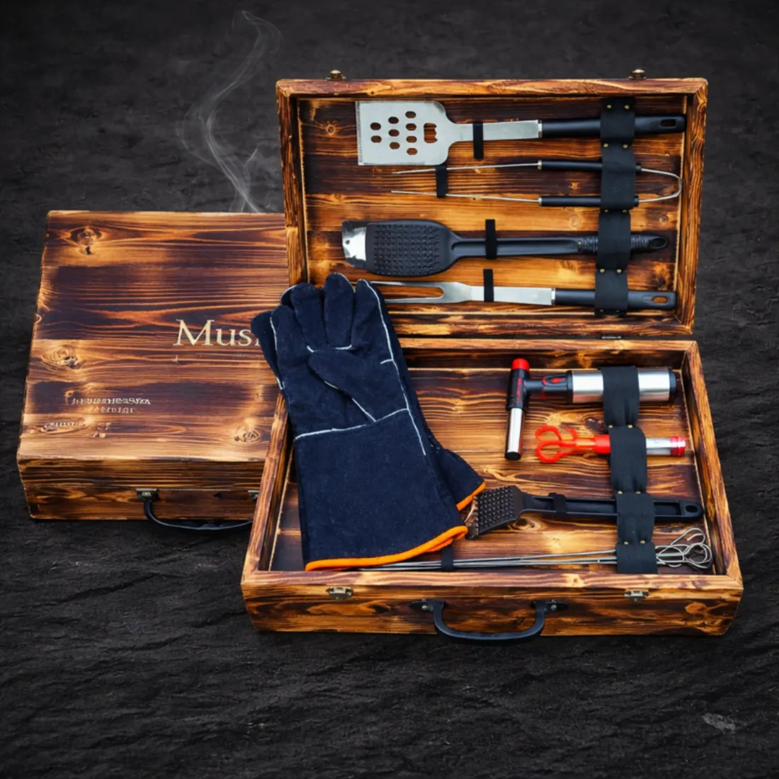 Patogus ir išskirtinio dizaino, įrankių ir priemonių rinkinys, supakuotas rankų darbo, degintos medienos lagamine. Šiame rinkinyje rasite viską, ko gali prireikti kepant, vartant, papildant, tepant ar nuimant kepamus produktus, kuriuos saugiai ir lengvai galėsite gaminti pagal savo poreikius.