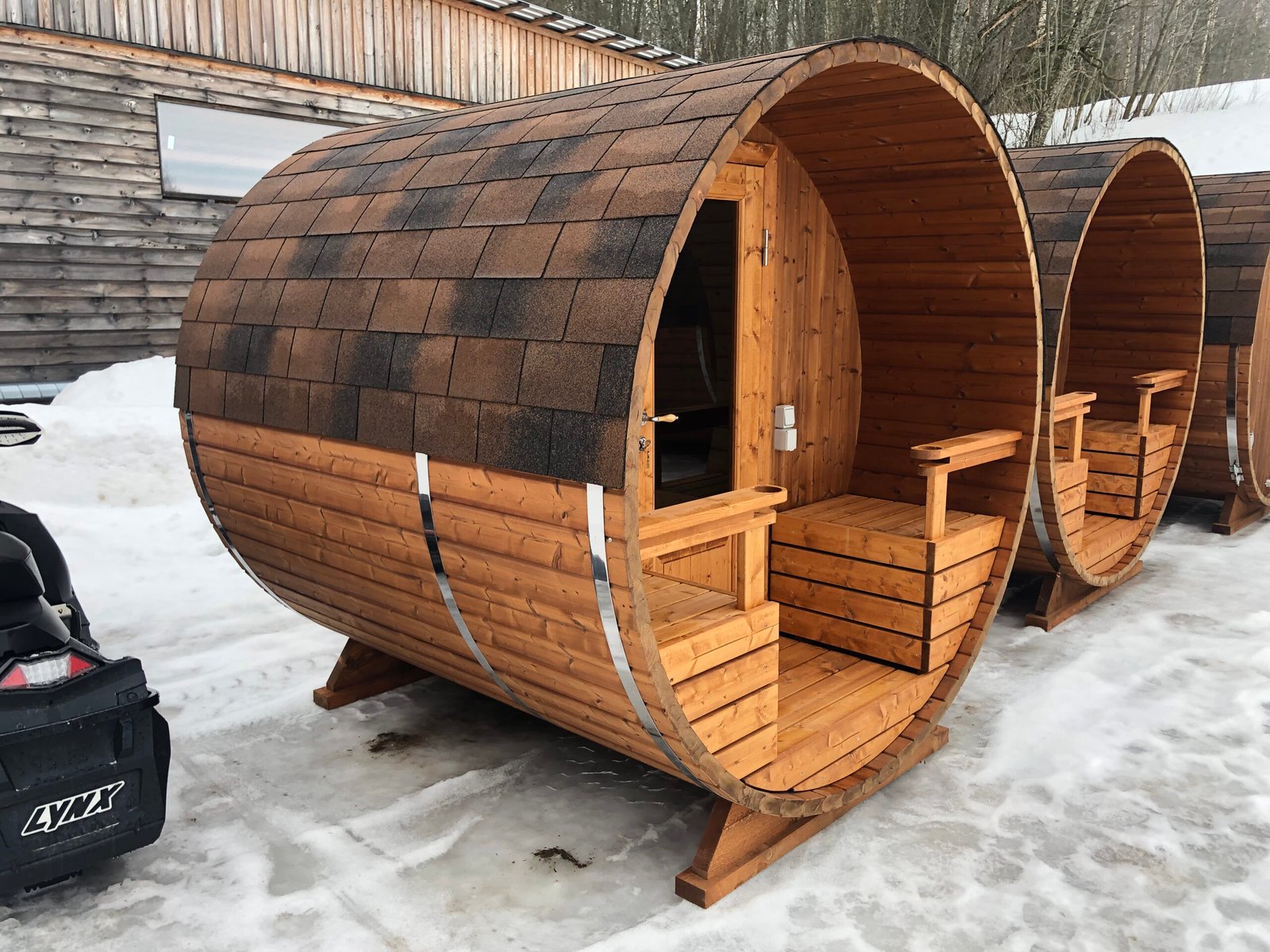 Medinė statinės formos pirtis (skersmuo ~205 cm, aukštis ~220 cm, ilgis su terasa ~209 cm)