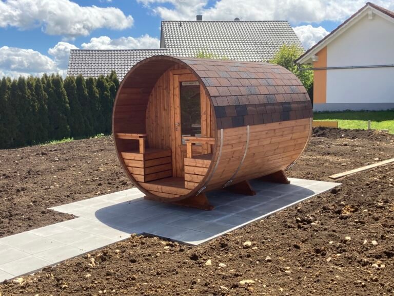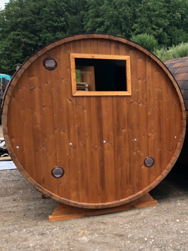 Prabangi panoraminė statinės formos pirtis 6 asmenims su stikline siena, terasa ir malkomis kūrenama krosnele.