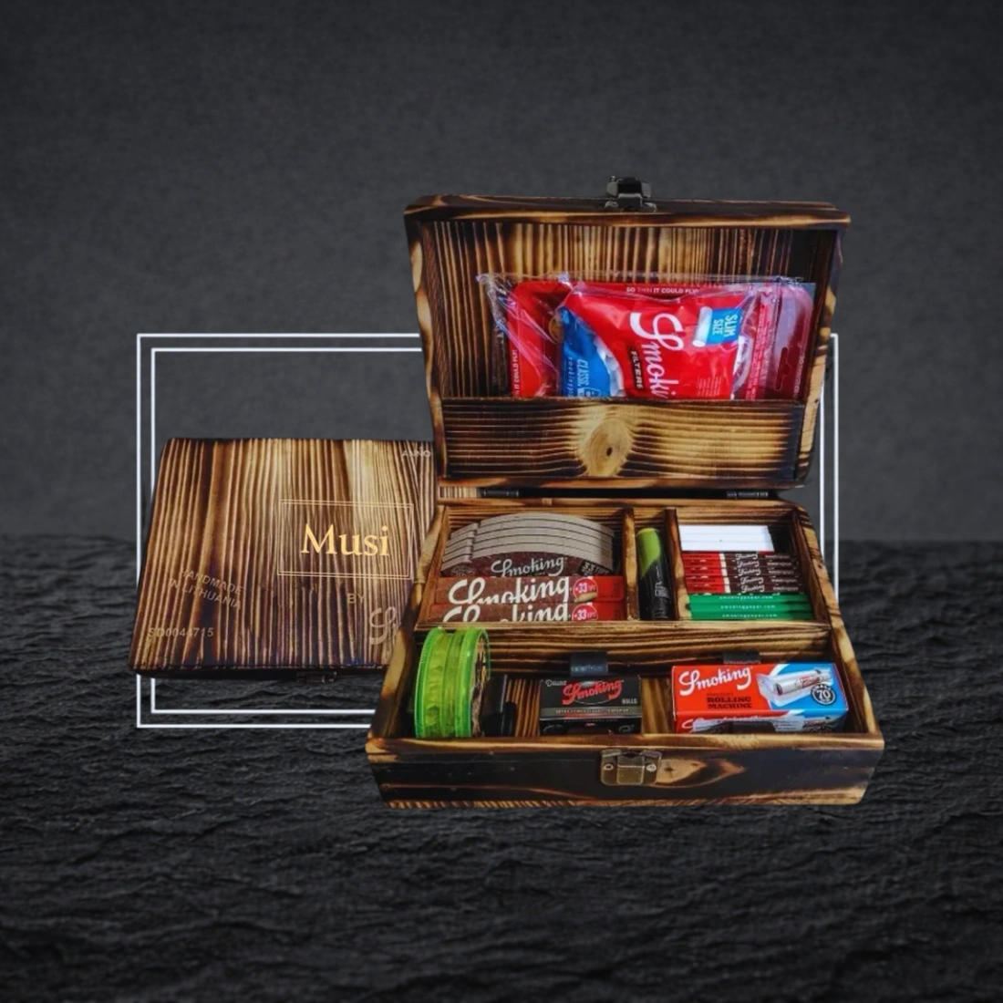 Krištolo grafino, taurių, cigaro, daugkartinių šaldymo kauliukų bei pypkės rinkinys rankų darbo, degintos medienos lagamine. Kaip ir visus mūsų gaminius šį rinkinį galime personalizuoti norimu tekstu arba paveikslėliu. Norimą personalizavimą galime derinti info@musibrand.eu
